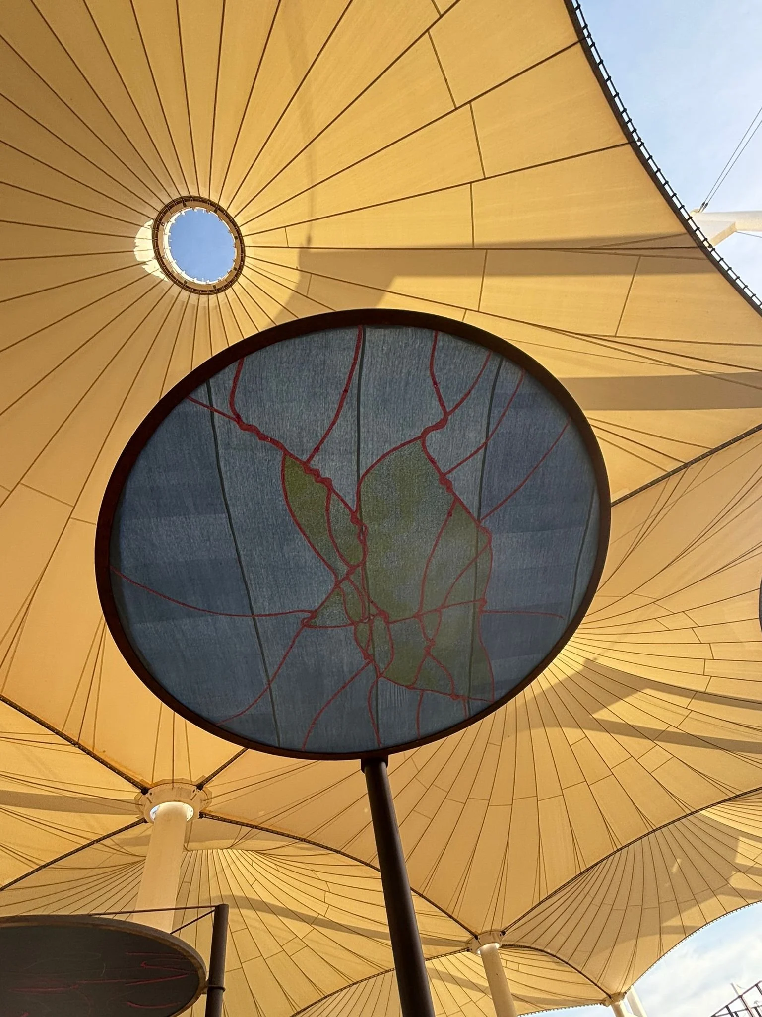 An Omniscience : the sanctuary is a sensory garden that encourages the visitor to find grounding in the earth while dreaming about flying in the sky. Comprising local plant species, adapted to arid and saline environments, which absorb radiation from the soil and the air, the garden is a refuge where humans and nonhumans cross paths with each other symbiotically, resisting the whirling machinery of modernity. Visitors are invited to lie down among the medicinal plants and look up at the flight paths of birds (and planes) embroidered on indigo-dyed tapestries hovering above the garden. Par Tola kantha embroidery was created in accordance with Islamic principles, in harmony with abstract geometric linology, evoking the myriad symbolism of lines, from life lines to blood lines, DNA, constellations, navigation and flight paths. Its practice transcends gender and class barriers.
